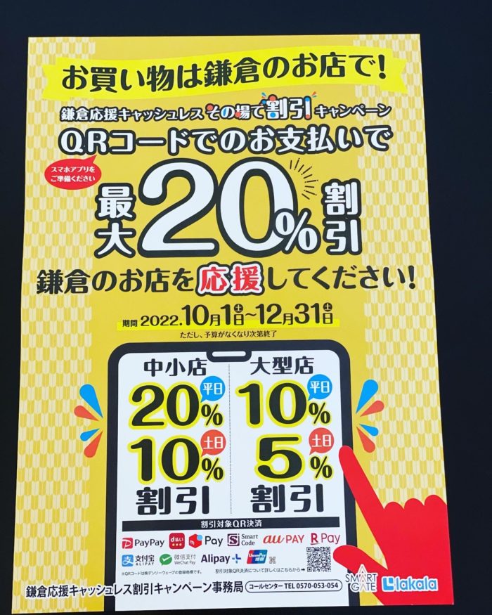 キャッシュレス決済✨ 2022-10-062022-10-25 ShokoNews 10月より鎌倉応援キャッシュレス割引キャンペーンが始まりました✨✨期間中QRコード決済のお支払いで💰平日→20%off 土日→10%off (上限¥20000まで)となります👍このキャンペーンに伴い端末を導入したのでkobakoでも・QRコード・クレジットカード決済(お支払額¥10000以上の方に限ります)が可能になりました👍 この機会に是非ご予約お待ちしております<m(__)m>